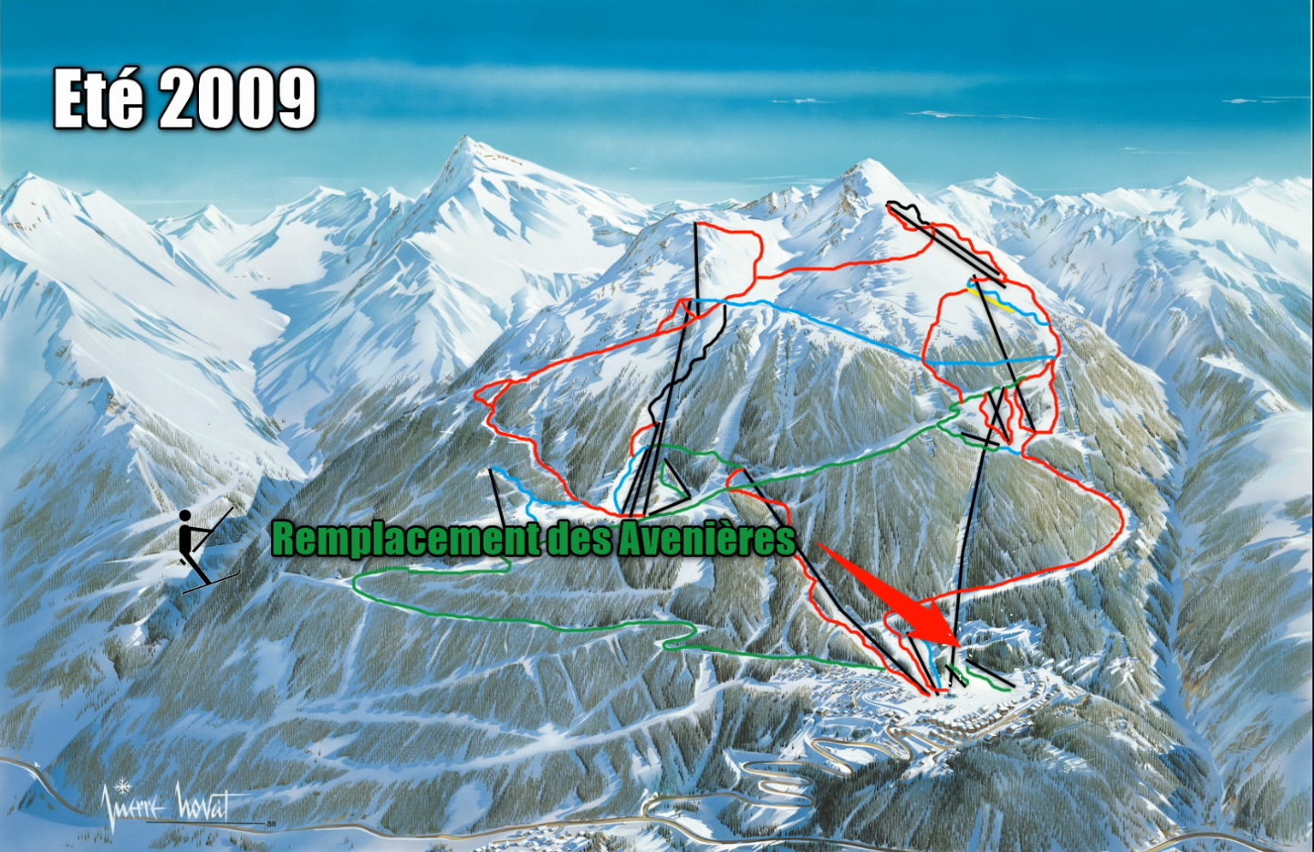 Mise en serviceLa ligne du téléski des Avenières avant 2013 et le déplacement du premier pylône vers l'aval et la création du P2 au pied de la montée principale de l'installation située juste avant le pylône 3.